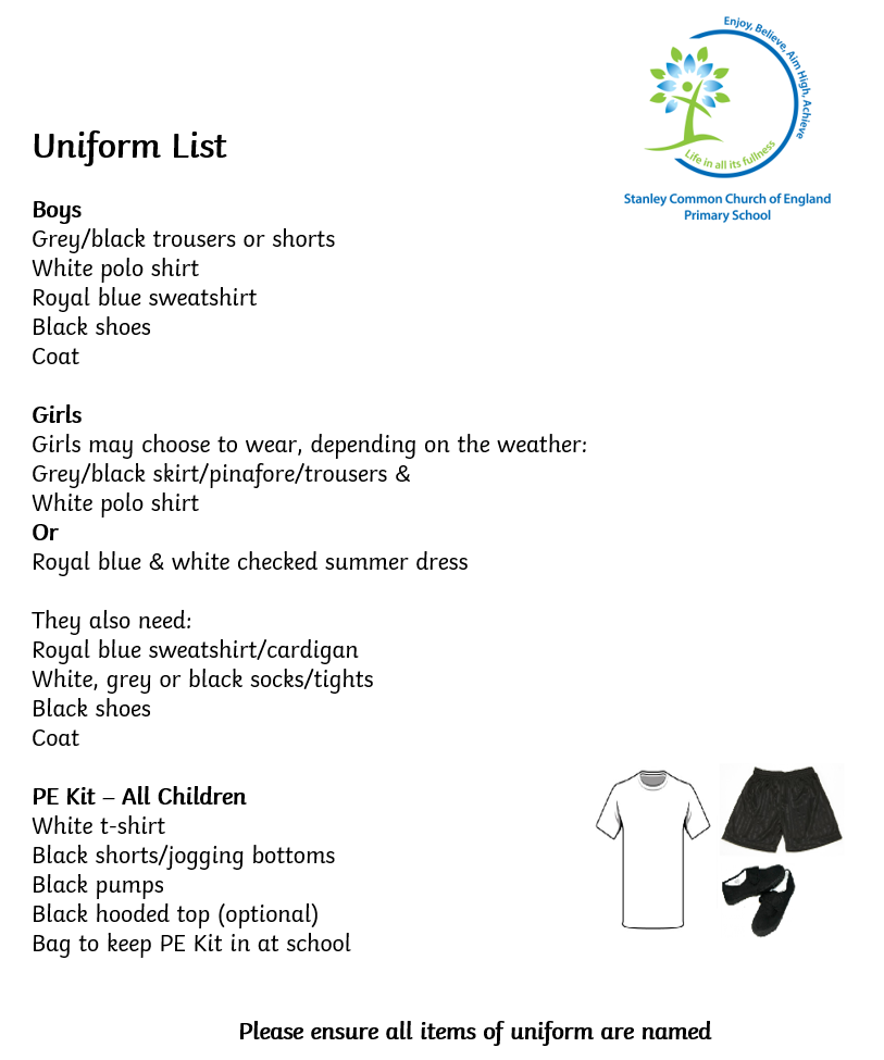 If you need support with correct uniform, please let your child’s class teacher know or speak to the office and we will support you where we can. We do have some access to a small selection of spare, second hand uniform that can be borrowed, if it is needed.